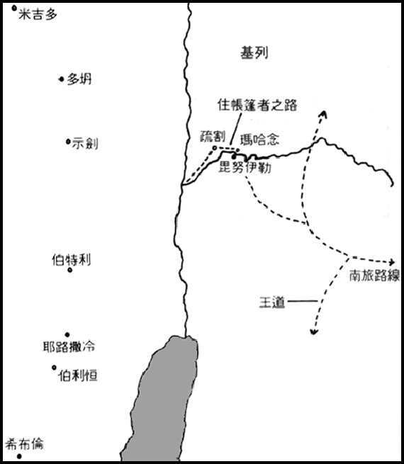 在这时候,我们必须推测流便被召去处理牛羊群一些紧急事故。其他兄弟也一定退离那坑较远之处吃饭。当他们正吃的时候,看见一队以实玛利人正沿着那商路,从基列去埃及。这可能是较早时,关及雅各在玛哈念时,所提‘住帐棚者的路’的延续,而且联入那接海岸的,伟大的国际‘海路’(参看下图──到大海之路及住帐篷者之路)。以实玛利人所带的树脂和油膏,在埃及用作药物和搽油,需求很大(参看耶八22)。