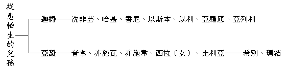 (三)迦得的儿子中,亦有三个名字不同(括号内的名字是本章的):洗分(洗非芸),阿斯尼(以斯本),亚律(亚罗底)。