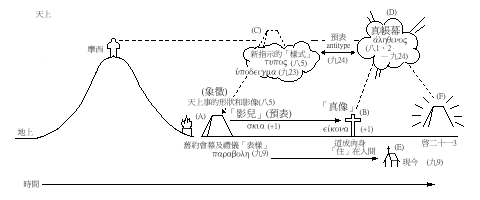 至于垂直线的预表,A是“天上事的形状和影像”(八5),象征摩西在山上所得的指示(C),但却非单纯的象征,因为摩西所见的并非真像本体,C乃是样式( tupos八5; hupodeigma九23),也是影像( antitupos)预表D,“天上的本物”,“天堂”(九23、24)的“真帐幕”(八2,九24),而这真帐幕不错已在B“末世显现一次”(九26),藉着耶稣“道成了肉身住(原文意思支搭帐幕)在我们中间”(约一14),但天上真帐幕将完全应验在地上,“向那等候祂的人第二次显现”(九28),那时“看哪,神的帐幕在人间,祂要与人同住,他们要作祂的子民,神要亲自与他们同在,作他们的神。”即图中的F。