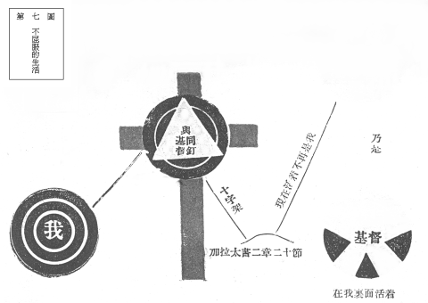 因为我们在天上的基督里面,所以他也在地上的我们里面。在我们里面的基督随便在什么地方都能生活,那就是他所想望的。这种真理的根苗,在我们的主与他的门徒最后的谈话中已经说明了。他已经告诉他们说,他要离开他们,所以他们以为离开了他怎样能够做他真正的门徒。这种最后的谈话,使他们确信他要藉着圣灵和他们同在,并且他们将来的关系,比他们现在和他的关系还要真切与重要。在他葡萄树里面的生命以同样的流到他们这些枝子里面。故主在约翰福音十五章五节说:‘我是葡萄树,你们是枝子;常在我里面的,我也常在他里面,这人就多结果子;因为离了我,你们就不能作甚么。’在那最后的一天晚上,我们的主也同样负着大祭司祷告的责任。约翰福音十七章二十三节及廿六节纪着说:‘我在他们里面,你在我里面,使他们完完全全的合而为一,像我们合而为一。‘我已将你的各指示他们,还要指示他们,使你所爱我的爱在他们里面,我也在他们里面。’‘我在他们里面’──这句话虽然很简单,但是这种在祷告末了很重要的话是要表示他心中热烈的愿望,一直可以传到几世纪以后。从前和现在,耶稣基督还是愿意把他自己往在基督徒的里面。使徒保罗在默示中能够得到宝贵的荣耀的真理,而且这种真理在他的经验,教训,和传道事业方面是互相错综的。‘基督在我里面活着,’就是他个人灵性生活里最高的一点。他在加拉太书二章二十节说:‘我已经与基督同钉十字架;现在活着的不再是我,乃是基督在我里面活着;并且我如今在肉身活着,是因信 神的儿子而活,他是爱我,为我舍己。’又在腓立比书一章二十一节说:‘因我活着就是基督,我死了就有益处。’‘基督在我里面活着,’所以‘我活着就是基督’──在保罗看来,除了这事以外,并无别的东西使荣耀的基督变成他自己的生命,可以包括保罗心灵上一切的经验。在他看来,这就是最高平面上的生活。