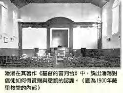 蓝姆西写着,“潘汤相信神将《晨光报》交在他的手中编辑出版,是为了让这些真理(责任和交账)广为人知。”然而,这些真理并没有占据他全部的思想,也没有占去《晨光报》最多的篇幅。这使我们确信,潘汤是在基督的信仰和神全地工作的前提下来领会这些真理。我们若要深入认识潘汤,理应以他从神所领受的主要托付着手,也就是在他最主要的两卷著作《基督的审判台》(The Judgment Seat of Christ)和《被提》(Rapture)所详细解释的。 以下是《基督的审判台》的摘录,说出潘汤对信徒如何得赏赐与惩罚的认识。千年国,就是从主耶稣的再来开始,一直到新耶路撒冷永世的来临,将会是一些信徒得赏赐的时候,也会是其它信徒受亏损的时候。在基督的审判台前,每一个信徒都会“在基督的审判台前显露出来,叫各人按着本身所行的,或善或恶,受到应得的报应。”(林后五10) 信心与赏赐 永远的生命是在于简单、得救的信,这信产生了实时的重生,合并进入基督,圣灵的内住,以及不朽坏的生命。“信入子的人有永远的生命”(约三36),我们若研读神的话,就知道一个新的境界已经向蒙救赎的魂开启了。若生命是借着信,赏赐则是信入后的结果。(第4页) 神所赏赐的 祂会赏赐那些神圣的行为(路六35)和在隐密中的祷告(太六6)。我们的心会影响主对我们服事的判决(路六37)。我们在主面前所有的劳苦,都会一点不差的得到回报(太十41~42,加六7)。神至高的赏赐,是根据所有服事的动机到底是什么来决定的(太六1,林前四5)。赏赐也是给所有为基督受苦的人存留的(路六23,来十一26)。 血和酵的表号 这两面的表号,微妙的向我们开启了神两面的真理。穿上血是称义;除酵是圣化:穿上血是基督为我们工作;除酵是圣灵在我们里面动工。(第9页) 公义审判的日子 那要来世代的严格法理本质,是信徒们得赏赐的决定性启示。因为“那日”,与现今这个世代完全相反,那不是恩典的世代,而是公义审判的世代(罗二5)……第一,主在审判台与祂的奴仆算账(太二五19),宣布审判的开始(彼前四17);第二,主再来的时候,弥赛亚宝座的荣耀,要在地上的万民中间做分别的工作(太二五31~32);第三,白色大宝座(启二十11),要在所有死了的人中间举行大审。(第11页) 审判台 我们现在来到对召会启示最重要的一点-基督的审判台。我们必须-因这是神圣的公义内在的需要,全部-包括所有使徒,所有申言者,所有殉道者,要被显明-显明给我们的良心看,显明给世界看,更重要的是显明给那审判者看;各人按着本身所行的(林后五10),在基督的审判台前,每个人都要接受审判-这是得工价的专有名词(Dean Alford)。(第14页) 门徒们所要面对的判决是特别的。第一,这是一个台,而不是座;是一个为着审察门徒的审判台,而不是传讯背叛者的宝座;第二,被审察的只有基督徒;第三,这不是为着生命的审判;第四,审察过程是个人的;“这样看来,我们各人必要将自己的事向神陈明。”(罗十四12)(第15~16页) 经火试验的工作 就像以赛亚所说的,不必试验根基,因为已经是试验过的石头:火所搜寻的,乃是在根基上的建造。信徒不会因着他的立场,而会因着他的行事为人受审;并不是因着他的信心,而是因着他的工作受审;并不是因着他的生命,而是因着他的生活受审;并不是因着他的根基,而是因着他在根基上面的建造受审。“各人的工程必然显露;牠要在火中被揭露,这火要试验各人的工程是那一种的。”(林前三13)那火会准确的将工程的材料显露出来,因为,乃是基督的眼来一遍又一遍的搜寻(启一14)。(第21页) 冠冕 保罗启示出赢得冠冕的条件,这是他给全召会的命令。自制是赢得冠冕的必备条件,这冠冕的荣耀也应成为我们的魂儆醒的动机(林前九24~27)。不服从会失去冠冕(启三2)。所有的冠冕都根据于我们相信以后的工作:不朽坏的冠冕(林前九24~25),喜乐的冠冕(帖前二19),荣耀的冠冕(彼前五1~4),公义的冠冕(提后四7~8),和生命的冠冕(雅一12)。对一个信徒来说,“失去冠冕”的真理与圣经上任何一个真理是同样的真实。(第26页) 基督徒的职责 有一个特殊的名字说出了所有的过犯-你这“懒惰的奴仆,无用的奴仆”(太二五30),主没有用“未重生”或“背道”这些字眼来形容这个奴仆,因为他没有乱用、盗用,或浪费主的银子,只是藏了起来。我们的主到底控告他什么?不信、没有重生、背叛、背道、奸淫、偷窃或谋杀吗?都不是,而是他这一生什么成就都没有;他所做错的,就是在服事上保留了他的能力;他应当扩展的时候,他却囤积;他没有一点神圣的责任感。(第32页) 千年国 很明显的,赏赐与荣耀-就是门徒的冠冕-是以性格与服事为条件;到底这个原则将怎样影响一个门徒是进入千年国、或是被留在外头呢?(第35页) 在读神的话之前,我们应当知道,许多敬虔的基督奴仆,因着认识圣经,因而教导信徒他们有被排除在千年国之外的可能……“唯有那些有分于基督的降卑与苦难的人,才有可能荣耀的进入头一次的复活;也唯有他们才能领受蒙救赎之人中那特殊的一份……”(克雷 文博士,Dr. E. R. Craven,启示录Apocalypse编辑)。“对那些仅仅信主的人,主实在赐给了他们永远的生命,但对他们来说,这生命丰盛的果实,必须要等到一千年的作王掌权结束的时候才开始。所以,这些人并不被允许进入诸天的国。”(彭伯,G.H. Pember)(第38~39页) 被排除于圣地之外 神在这里所设计的表号-与圣经里其